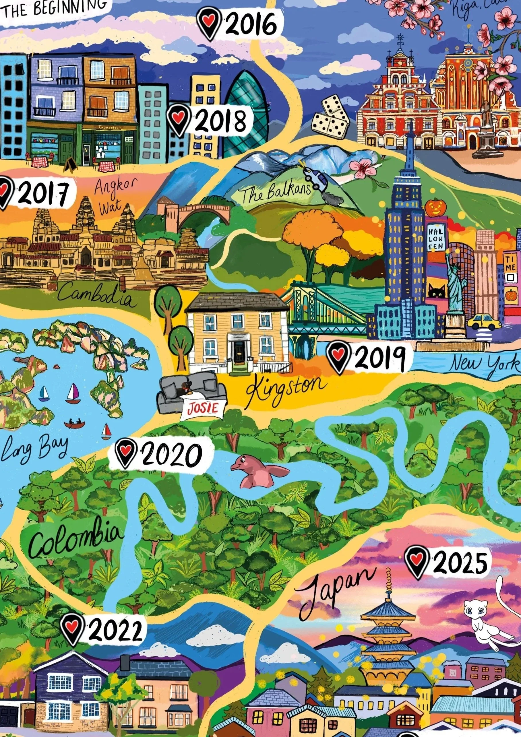 Fourteen meaningful locations, brought together in one bespoke illustrated map. Simply send over your chosen spots along with any reference images or extra details, and I’ll create something uniquely yours. Email to commission - katieforemandesign@gmail.com